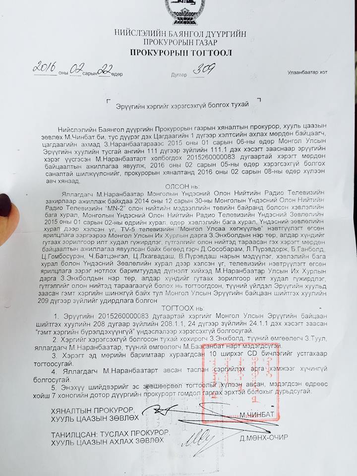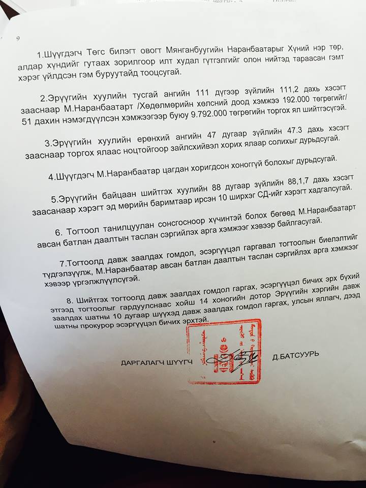 Бодит үнэн, төрийн машин хэн нэг эрх мэдэлтний гарт орохоороо ийм л байдаг юм билээ. Энэ бүхний эсрэг өөрийн биеэрээ, үнэн ялна гэсэн зоригоороо сөрж зогссон доо. Ингэж явсаар эхний шүүх хурал болж, хэдэн муусайн найзууд, хэвлэл мэдээллийнхэн маань ирлээ. Гэтэл гэнэт л “шүүх хурал хаалттай болно” гээд хэнийг нь ч оруулсангүй. Хөдөлмөрийн хөлсний доод хэмжээг 51 дахин нэмэгдүүлсэнтэй тэнцэх хэмжээний торгуулийн ял оногдуулсан шүүхийн шийдвэр гарлаа. Сонссон найз нөхөд маань бараг л баярлах нь ээ, эрх мэдэлтэй хонзонч этгээдээс нийгэм тэр чигээрээ л айдаг юм билээ. Гэвч хамгийн 1-рт гүтгээгүй учир, 2-рт энэ ялыг зөвшөөрснөөр би гэдэг хүн 5 жилийн хугацаанд ял шийтгэлтэйд тооцогдож, ямар нэг алба ажил хаших эрх маань хасагдах учраас зөвшөөрсөнгүй, давж заалдсан. Энэ нь соц үеийн цөллөгөөс ч дор ял. Тэгээд, явсаар өнгөрсөн оны 9 сард өнөөх “хэрэг” гээчид Дээд шүүхийн хяналтын шатнаас “Мөрдөн байцаалт нэг талыг барьж явуулсан, шүүх хурал хаалттай хийх шаардлагагүй, зайлшгүй нотлох баримт нягтлаагүй” гэсэн үндэслэл бүхий тогтоол гаргаж, анхан шатны мөрдөн байцаалтанд буцаасан. Мөрдөн байцаалт хийгдсээр өнгөрсөн 2-р сард “Гэмт хэргийн бүрэлдэхүүнгүй” гэсэн прокурорын шийдвэр гарав.