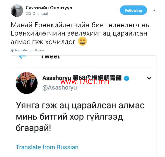 Уянгад хандан заналтайхан бичжээ. Харин үүнийг нь жиргээчид Ерөнхийлөгчийн зөвлөх Г.Уянгад хаягласан үг хэмээн таамаг дэвшүүлсэн байна. Хэрвээ энэ нь үнэн байх аваас эрхэм Ерөнхийлөгч Х.Баттулгын зөвлөхүүд хоорондоо тийм ч найрсаг харилцаатай байдаггүй бололтой.