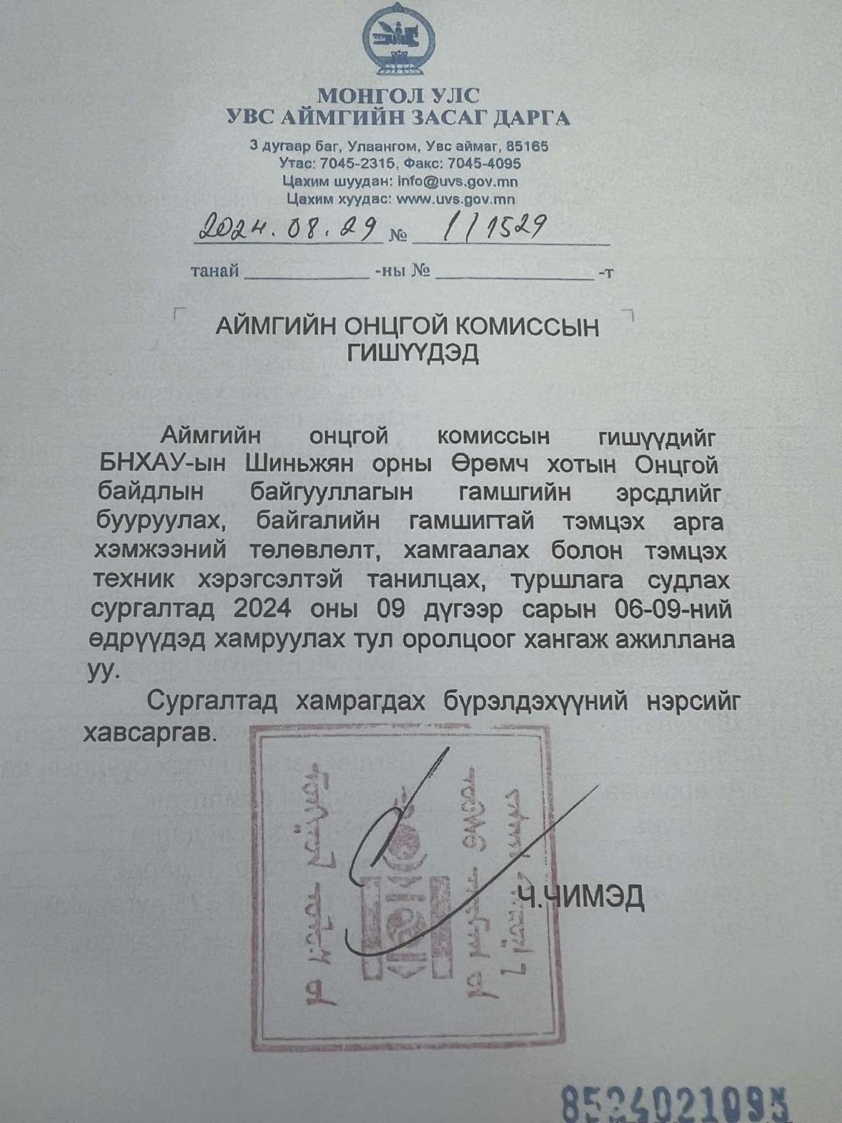 Увс аймгийн засаг дарга Ч.Чимэд нь орон нутгийн сонгуульдаа дэмжлэг авах, өөрийнхөө талд ажлуулах зорилгоор хууль хяналт, цэрэг цагдаа, төрийн байгууллагуудын удирдлага 19 хүнийг гадаадад аялуулж зугаацуулахаар 2024.09.06-ны өдөр өмнөд хөршийг зорихоор зэхэж байна. Харамсалтай нь тэрээр амин хувийн энэ ажлаа хувийнхаа биш улсын мөнгөөр хийхээр онцгой комиссын нэр барьж, аймгийн онцгой комиссын гишүүдийг гадаад сургалтад хамруулах нэрийдлээр хэрэгжүүлэхээр төлөвлөн хэрэгжүүлж байна. Тухайлбал, Ч.Чимэд нь аймгийн засаг даргын нөөц сангаас өөрийгөө оролцуулаад хуурамч сургалтад хамрагдсан 20 хүн тус бүрт 4-5 төгрөгийн төсөв зарцуулахаар тушаал шийдвэр гаргаад байна.
