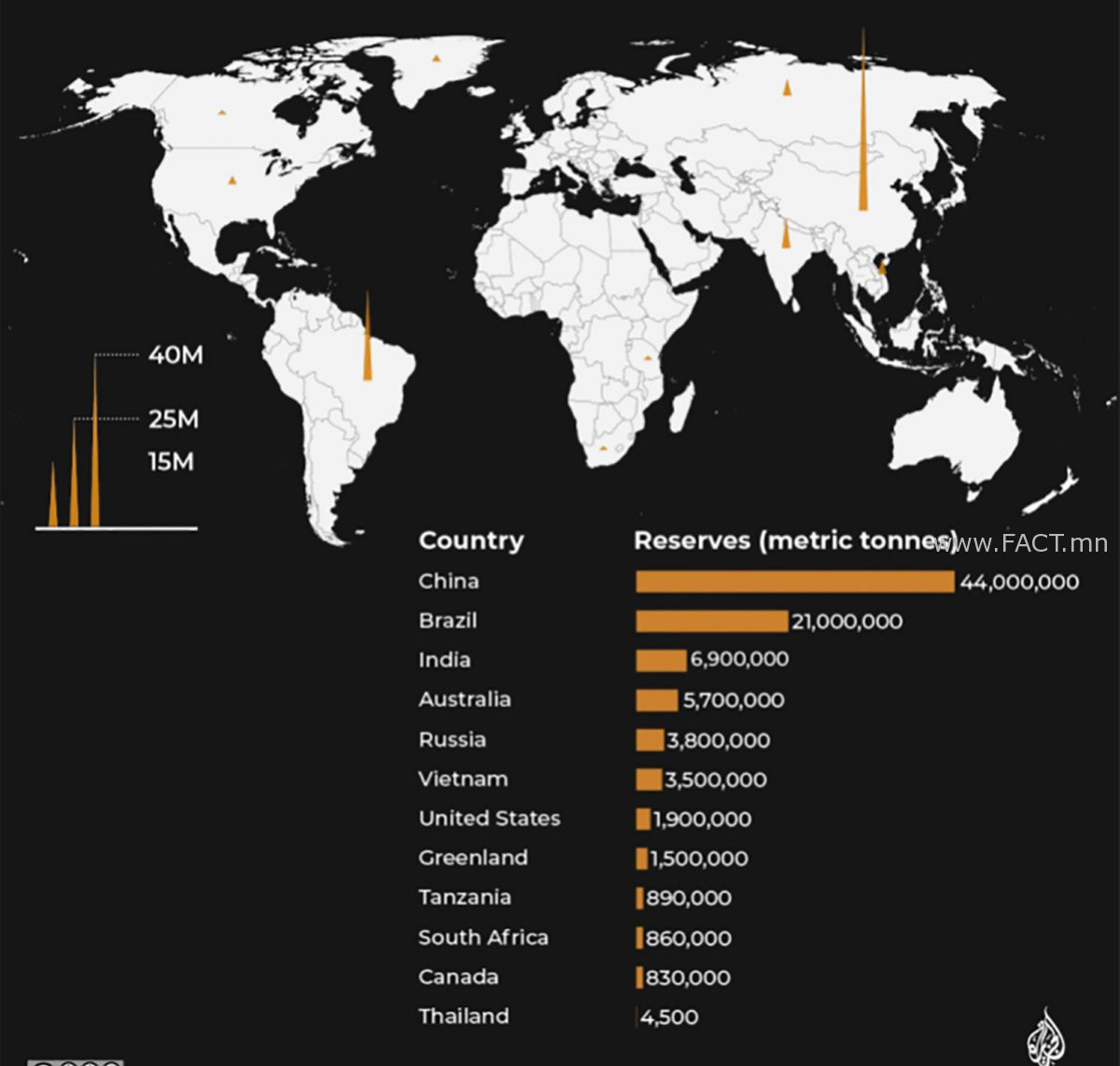 АНУ-ын Геологийн албаны 2025 оны хоёрдугаар сарын тайлангаас үзэхэд ховор элементийн нөөцөөр тэргүүлж буй 10 орны жагсаалтад БНХАУ, Бразил, Энэтхэг, Австрали зэрэг улс орнууд тэргүүлж байна.