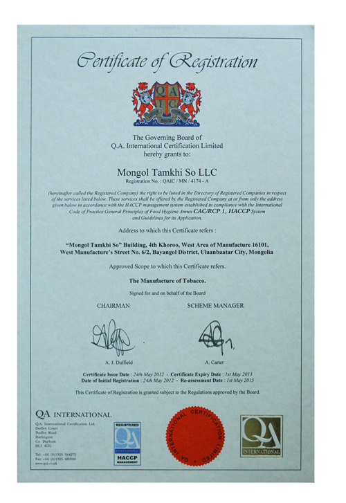 Ийнхүү “МОНГОЛ ТАМХИ СО” ХХК нь HACCP тогтолцоог өөрийн үйл ажиллагаандаа бүрэн нэвтрүүлж бүтээгдэхүүнийхээ чанарыг баталгаажуулж дэлхийн түвшинд хүлээн зөвшөөрөгдөж чадлаа.