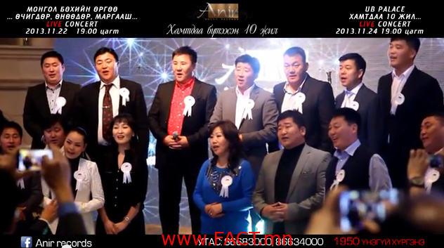 Сонирхуулахад дуунд дуртай дуучин монгол түмний даган дуулдаг олон сайхан хит дуунуудыг бүтээсэн “Анир” дуу бичлэгийн студийн 10-н жилийн ойн энэ онд тохиож байгаа бөгөөд ойн хүрээнд монголын дууны урлагийн гурван үеийн төлөөлөл болсон шилдэг уран бүтээлчдийн зөвхөн “ХИТ” дуунууд эгшиглэх “…Өчигдөр Өнөөдөр Маргааш…” супер шоу тоглолт 11-р сарын 22-ны өдөр 19:00 цагаас “Монгол бөхийн өргөө”-нд болох юм. Мөн 11-р сарын 24-ны өдөр 19:00 цагаас”UB PALACE”-ын концертийн их танхимд “Хамтдаа 10 жил” хүндэтгэлийн тоглолт тус тус тоглогдох юм.