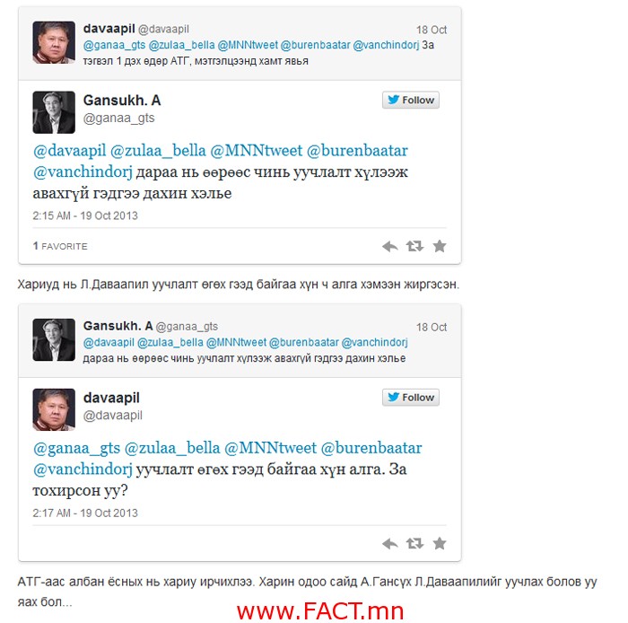 Зам, тээврийн сайд А.Гансүх иргэн Л.Даваапилтэй твиттер хуудаснаа ширүүхэн маргалдсны эцэст хуулийн байгууллагад хандсан билээ.