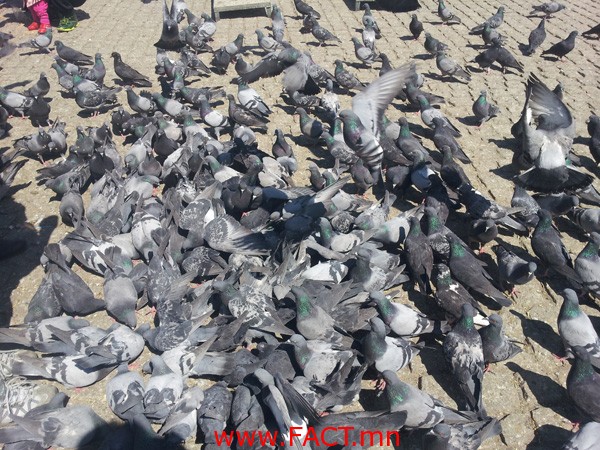 Гандангийн төв талбайд очлоо. Гялгар торонд дүүрэн будаа хийсэн настай хүн, цэцэрлэгийн насны хүүхэд хөтөлсөн залуус, оюутан бололтой тагтаа хооллож зураг авахуулсан хэдэн охин, дээлтэй эрэгтэйгээс өөр хүн бараг л алга. Дээлтэй хүнтэй ойр зуур ярилцвал ”Хөдөөнөөс ирсэн болохоор Гандан орж ном уншуулаад тагтаа хооллоод явж байна. Манай хамаатнууд тагтаанаас шувууны ханиад тусна гэж яриад байсан. Тагтаануудыг жинхэнэ цэвэр тариагаар хоолловол янз бүрийн өвчин тусахгүй байх” гэсэн юм. Шатан дээр 500 төгрөгөнд хоёр уут тариа өгч байгаа эмэгтэйтэй ярилцангаа тагтаанд тариагаа цацаж өгвөл бөөнөөрөө ирж бие биенээсээ өрсөн булаалдаж байлаа. Эгээтэй л бие биенээ хэмлэх шахав. Тариа зарж байсан бүсгүй “Өглөө 7:00 цагийн үед намайг ирэхэд энэ хайрцагтай тариаг гаднаас нь тоншоод байлгахгүй.