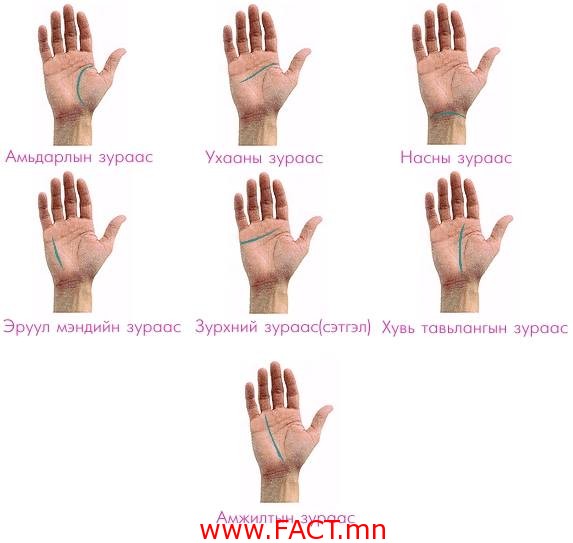 5. Амьдралын зураасыг унших нь: Эрхий хурууны хавиас эхлээд алганы доод хэсэг хүртэлх нумарсан хэлбэртэй зураас. Амьдралын томоохон өөрчлөлтүүд, ерөнхий ноён нуруу, эрүүл мэнд, наслалтыг тодорхойлогч юм.