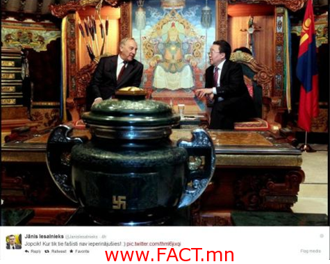 Харин Латвийн парламентийн сөрөг хүчин болох Үндэсний холбооны гишүүн Янис Иесалниекс Ерөнхийлөгчийн айлчлалын гэрэл зургийг үзэж суугаад нэгэн зүйлийг олж харжээ. Янис Иесалниекс “Монголын Ерөнхийлөгчийн өргөөний вааран дээр хас тэмдэг байна. Энэ муу фашистууд бүр хаа сайгүй байдаг болжээ” хэмээн твитертээ жиргэжээ.