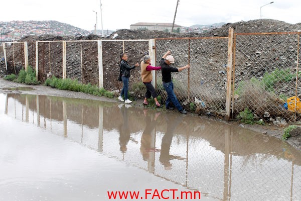 7-8-2Бороо үргэлжлэн орж нийслэлийн гудамж талбай их нууруудын хотгор болов. Шүхэр барьж, усны гутал өмссөн хүмүүс тогтоол усан дээгүүр гарах гэж мод чулуу дамжин “балетчин” шиг харайж байна. Энэ бол ойрын өдрүүдийн дүр зураг. Нийслэлийн төвд бол шавар шавхайд суучхалгүй тойрч аргалаад явах  ч хажуугаар давхих машинуудаас хувцасаа “хамгаалах” гэж бөөн юм болно. Зарим хүмүүс борооны уснаас болж гэрээсээ гарч чадахаа байжээ. Гэр хороололд байдал ямар байгааг сурвалжиллаа. Сүхбаатар дүүргийн дөрөвдүгээр хороо буюу бидний хэлж заншсанаар Дөлгөөн нуурын ойролцоох гэр хорооллын гудамжаар алхав. Гудамж нэлэнхүйдээ усанд автжээ. Харин хүмүүс цөөхөн байна. Иргэдийн хэлж байгаагаар “Өглөө хүмүүс ажилдаа явах гэж гудамжинд дугаарлаж байгаа. Нэгнийгээ татаж гаргах гэж их юм болно. Харин ажилгүй хүмүүс гэрээсээ гарахаа больсон. Гүехэн усны голд чулуу тавьж байгаад гардаг юм. Гүнзгий устай  газраар гарах боломжгүй учраас заримдаа 2-3 гудамж тойрч цагаа дэмий алдаж байна” хэмээн бухимдалтай байлаа.