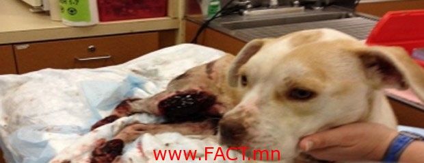 Чирэгдсэн нохой азаар амьд үлдсэн боловч хөлийнх нь арьс зулгаран унаж яс нь цухуйсан байжээ.