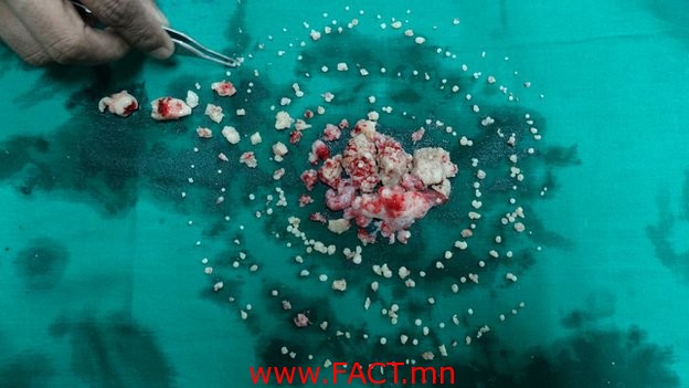 Мэс засал хийсэн эмч нар хэлэхдээ хүүгийн хавдрыг нээхэд жижигхэн “сувд” гарч ирсэн дараа дахиад нэг ахиад нэг гээд сүүлдээ бид залхаж эхэлсэн гэнэ. Ээлжиэлж авсаар 7 цагийн турш 232 ширхэг жижиг цагаан сувд шиг шүднүүдийг авсан гэнэ. Энэ нь маш ховор тохиолддог шүд эрүүний нэгэн төрлийн гажиг гэнэ.