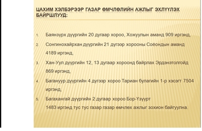 Ийнхүү эхний ээлжинд Баянзүрх дүүргийн 20 дугаар хороо Хожуулын ам, Сонгинохайрхан дүүргийн 21 дүгээр хорооны Соёондын ам, Хан-Уул дүүргийн 12, 13 дугаар хороонд байрлах Эрдэнэтолгой, Багануур дүүргийн 4 дүгээр хороо Тариан булагийн нэгдүгээр хэсэг, Баганхангай дүүргийн хоёр дугаар хороо Бор-Үзүүр гэсэн таван байршилд ирэх сарын 1-нээс эхлэн цахим системийг ашиглан газар өмчлөлийн ажлыг зохион байгуулахаар болсон байна. Үүнд нийт 1524 га газарт 14954 нийслэлд бүртгэлтэй иргэнд газар өмчлүүлэх аж.