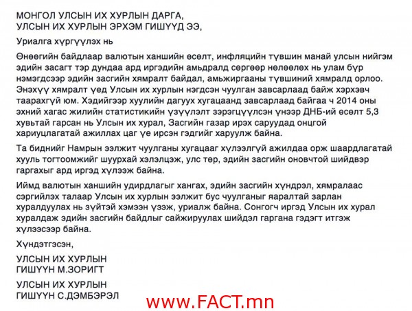 УИХ-ын гишүүн М.Зоригт, С.Дэмбэрэл нар УИХ-ын ээлжит бус чуулганыг яаралтай хуралдуулах уриалга гаргажээ. Тус уриалгад эдийн засаг хямарч байгаа энэ үед УИХ амраад байж хэрхэвч таарахгүй. Хуулийн дагуу хугацаандаа амарч байгаа хэдий ч 2014 оны хагас жилийн статистикийн үзүүлэлт зэрэгцүүлсэн үнээр ДНБ-ий өсөлт 5.3 гарсан нь УИХ болон Засгийн газар ирэх саруудад онцгой хариуцлагатай ажиллах цаг үе ирсэн гэдгийг харуулж байна гэжээ. Тиймээс намрын ээлжит чуулганыг хүлээлгүй ажилдаа орж, шаардлагатай хууль тогтоомжийг шуурхай хэлэлцэж, улс төр эдийн засгийн оновчтой шийдвэр гаргахыг ард иргэд хүлээж байгааг дуулгажээ.