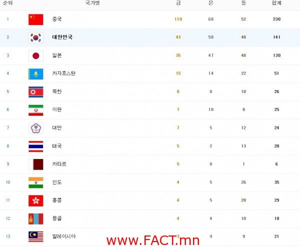БНСУ-ын Инчён хотноо болж буй Азийн спортын 17 дахь удаагийн наадам 11 дэх өдрөө үргэлжилж байна. Одоогийн байдлаар авсан медалийнхаа тоогоор Монгол улс 12 дугаарт бичигдэж байна. Манай улсын баг тамирчид жүдо бөхөөр 3 Алт, 3 Мөнгө, 4 Хүрэл медаль, буудлагын спортоор 1 Алт, 2 Хүрэл, чөлөөт бөхөөр 1 Мөнгө, 4 Хүрэл медаль, нийт 18 медаль аваад байгаа юм. Тэмцээнийг нийт 230 медальтайгаар Хятад улс тэргүүлж байгаа бол Өмнөд Солонгос улс 141, Япон улс 130 медаль авч тус тус удаалжээ.