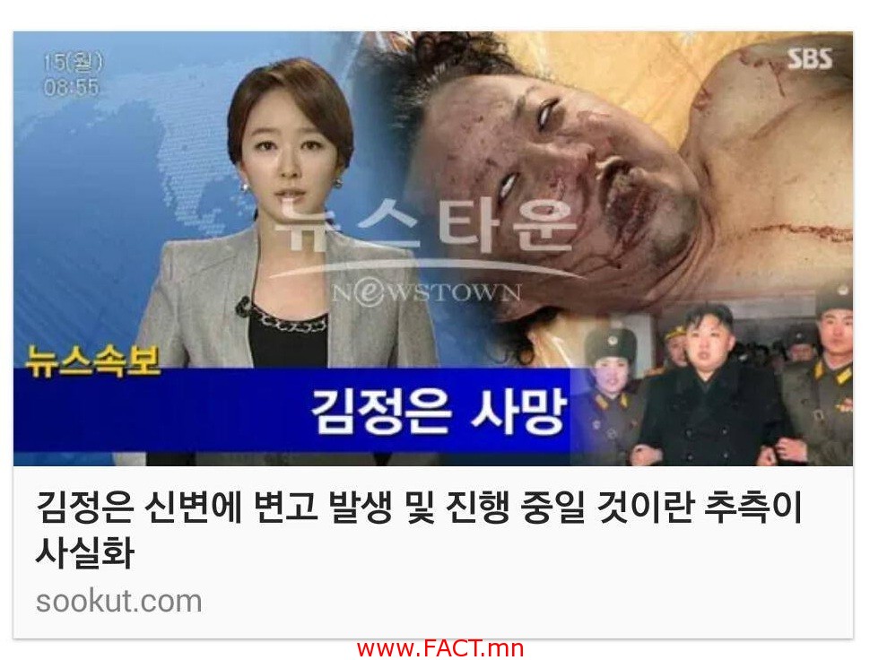 Хойд солонгосын удирдагч Ким Чен Ын гадны нөлөөтэй алагдсан зураг цацагдсан тухай өмнөд солонгосын SBS телевизээр мэдээлжээ. Энэ мэдээллийн үнэн бодитой эсэх нь одоогоор батлагдаагүй байгаа бөгөөд дэлхий нийтийн анхаарлыг татсан хурц асуудал болоод байна.