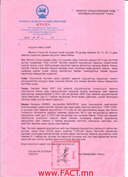 Г.Уянга гишүүн Ерөнхий сайдад асуулга тавилаа