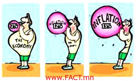 Харин нөгөө талд манай улсад орж ирэх гадаад валютын урсгал татарч, валютын ханш өссөнөөс болж зарим бүтээгдэхүүний үнэ өсч, инфляц Төв банкны төлөвлөснөөс 4-5 хувиар хэтэрсэн. Инфляц өнгөрсөн онд 12.5 хувьд хүрсэн бол өнгөрсөн сайрын байдлаар 13 хувь даваад байна. Гэхдээ энэ оны төгсгөлд инфляц 12.1 хувьд хүрэх хүлээлт байгаа аж.