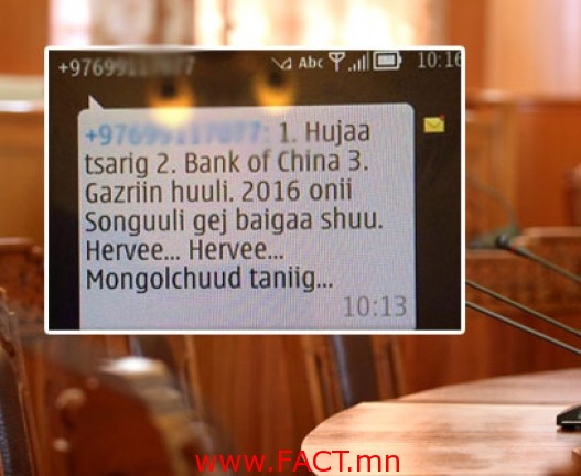 Өөрөөр хэлбэл өнөөдөр шуугиан тариад буй мессежний асуудал жирийн иргэний утаснаас бус УИХ-ын гишүүдээс эхлээд УИХ-ын даргын дугаарт хүртэл өөрийнх нь дугаараас мессэж ирсэн явдал юм.