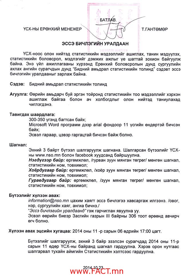 Бүтээлийг information@nso.mn цахим хаягаар хүлээн авах ажээ.