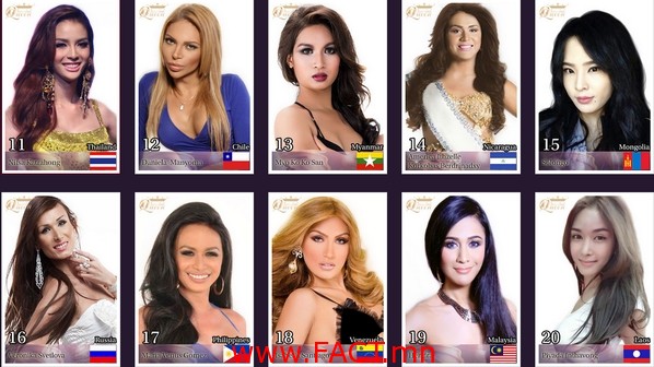 Дэлхийн трансжендэр бүсгүйчүүдийн дунд зохиогддог “Miss international queen 2014” тэмцээнд монгол улсаас Солонго гэх оролцогч оролцож байгаа талаар бид өмнө нь мэдээлсэн билээ. Уг тэмцээн нь 10 дахь жилдээ зохиогдож байгаа ба 50 гаруй орны 2000 оролцогчоос шилдгээ шалгаруулжээ. Манай улсаас оролцсон Солонго шилдэг 10 оролцогчийн нэгээр үлдэж, 8 дугаар байрт шалгарчээ.