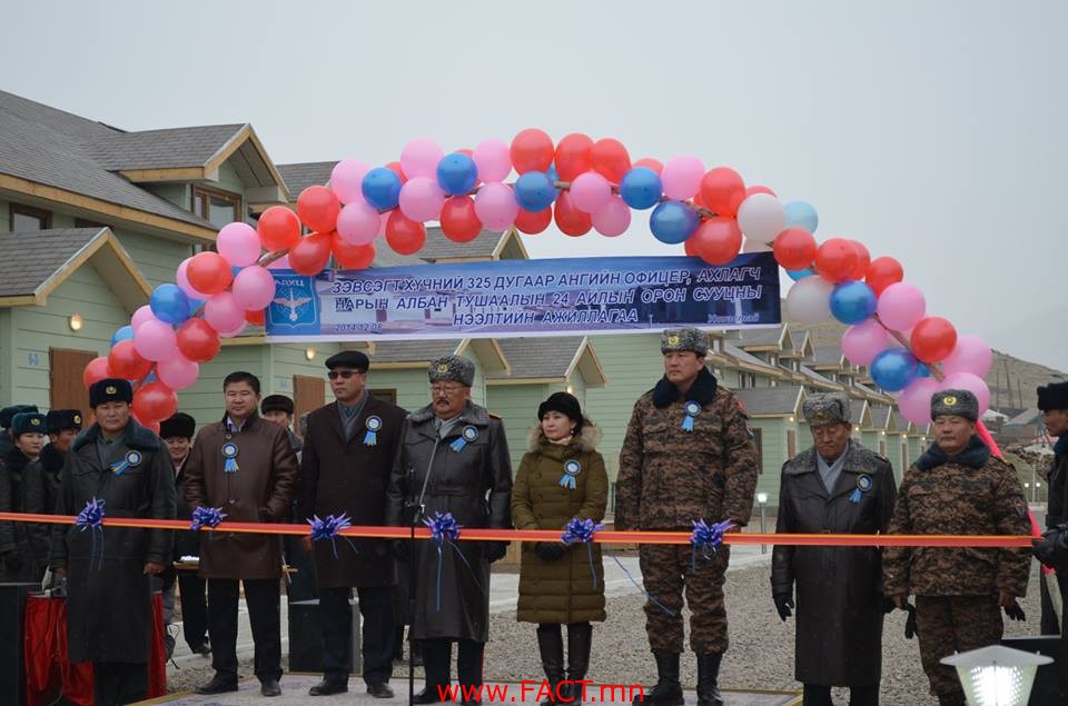 Завхан аймгийн Улиастай хотод байрлах Зэвсэгт хүчний 325 дугаар ангийн офицер, ахлагч нарын албан тушаалын 24 айлын орон сууцны нээлтийн ажиллагаа болж, албан хаагчид шинэхэн орон сууцны түлхүүрээ гардан авлаа. Нээлтийн ажиллагаанд Улсын Их Хурлын даргын зөвлөх З.Нарантуяа, Зэвсэгт хүчний жанжин штабын дарга, дэслэгч генерал Ц.Бямбажав, Завхан аймгийн Засаг дарга Ж.Жамъянтив болон албаны бусад хүмүүс оролцсон юм.