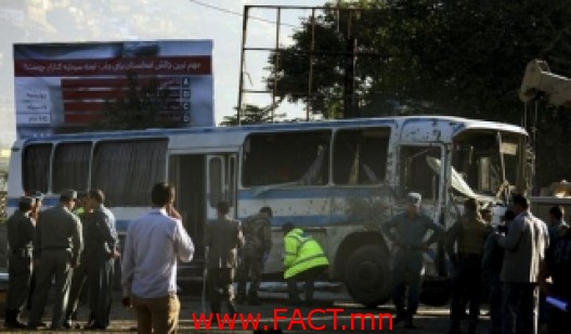 Өнгөрсөн амралтын өдөр амиа золиослогч этгээд нэг автобусыг дэлбэлсний улмаас Афганистаны БХЯ-ны зургаан албан хаагч амь үрэгджээ. Тэд нийслэл Кабул хот руу явж байжээ.