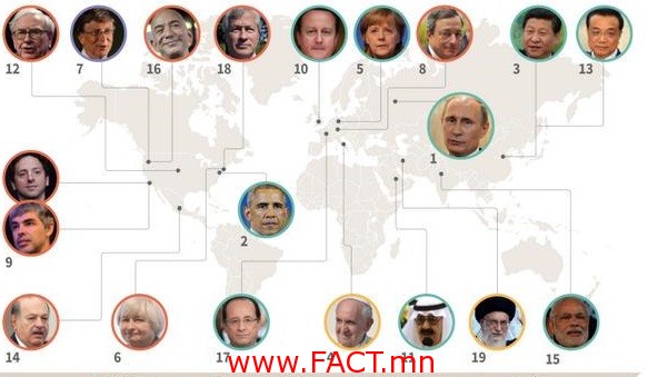 Эхний 19 удирдагчдын дотор улстөрийн 9 зүтгэлтэн орсон ба эхний гурван байрт ОХУ, АНУ, БНХАУ-ын удирдагчид орсон байна.