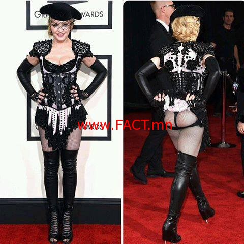 Тэгвэл энэ жилийн содон хувцас өмссөн хүн бол өдгөө 56 настай дуучин Мадонна байлаа. Тэрбээр ёслолын үеэр хар торон чимэглэл бүхий богино даашинз, хадаасан өсгийтэй урт түрийтэй гутлаар гангарч “Секси” имижээ гайхуулжээ. Харин ингэхдээ зүгээр нэг стилээ хадгалаад зогсохгүй тэнд цугласан олонд зориулж өөрийн ганган дотуур хувцсаа гайхуулаад авлаа.