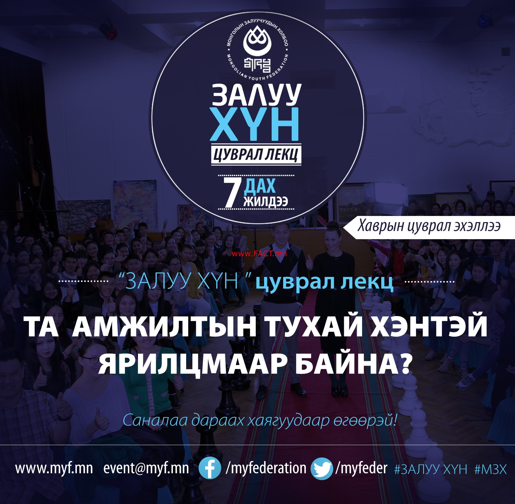 Монголын Залуучуудын Холбооноос жил бүр уламжлал болгон “Залуу хүн” цуврал лекцийг зохион байгуулдаг билээ. Монгол орны ирээдүй хойч болж, өнөөгийн нийгмийг түүчээлж яваа залуустаа өөрийгөө хөгжүүлэх, амжилтанд хүрсэн залуусаараа бахархан тэдний амжилт ололтоос суралцах боломжийг олгох зорилгоор энэхүү лекц нь 7 дахь жилдээ зохион байгуулагдах гэж байна. Салбар бүртээ шилдгийн шилдэг боловч олонд төдийлөн танигдаж амжаагүй манлайлагч залуучууд дүү нартаа өөрийн амжилтын түүхээсээ хуваалцаж, чин сэтгэлийн яриа өрнүүлж, чөлөөт сэдвүүдийн дор ярилцдагаараа “Залуу хүн” цуврал лекц нь онцлог билээ.
