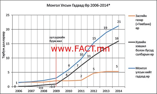 Манай улсын өр зээлийн статистикаас хархад 2009 онд дөнгөж 920 сая байсан хувийн хэвшлийн өр 2010 онд даруй 4.3 дахин ихэсч $4 тэрбум болж өссөн бөгөөд улмаар нэмэгдсээр 2014 оны эцэс гэхэд $16 тэрбум болсон байна. Хувийн хэвшлийн өр, зээлийн огцом өсөлт нь манай улсад уул уурхайн бүүм болж байсан он жилүүдтэй давхцаж байгаа юм (Дээрх графикийг харна уу).