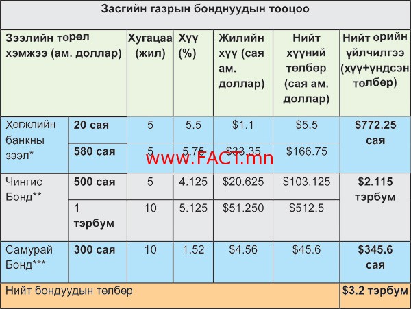 Бид эдгээр бондууддаа нийт 3.2 тэрбум ам.долларыг төлөх ёстой. (хүснэгтээс харна уу).