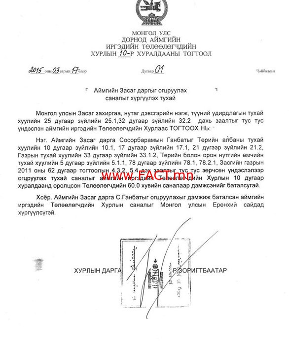 Засаг дарга С.Ганбатыг Төрийн албаны тухай, Газрын тухай, Төрийн болон орон нутгийн өмчийн тухай, Концессын тухай, Засгийн газрын 62 дугаар тогтоол, Сангийн сайдын 2012 оны 239 дүгээр тушаалыг тус тус зөрчсөн гэж үзсэн байна.