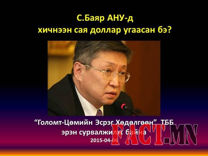 Авлигатай тэмцэх газар Ерөнхий сайд асан С.Баяртай холбоотой мэдээллийг шалгаж эхэлжээ. Өчигдөр УИХ-ын гишүүн Г.Уянгаас надаас тодруулга авсан байна. Тэрбээр golomt.org байгууллагаас ирүүлсэн дараагийн нэмэлт баримтыг гаргаж өгсөн байгаа юм.