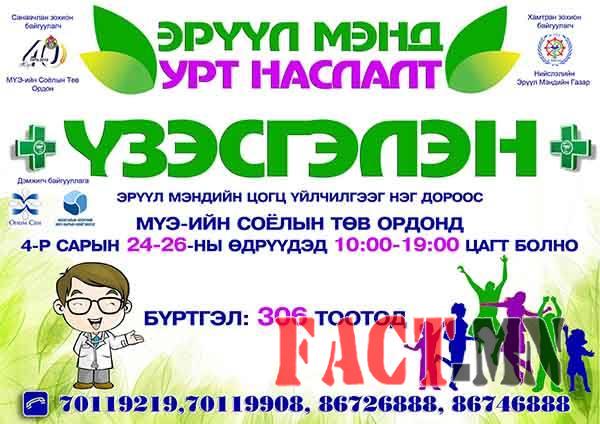 Эрүүл амьдралыг эрхэмлэгч, та бүхнийг энэ амралтын өдрүүдэд болох “ЭРҮҮЛ МЭНД – УРТ НАСЛАЛТ” үзэсгэлэнд хүрэлцэн ирж эрүүл мэндийн чиглэлээр  хэрэгтэй мэдээлэлээ нэг дороос авахыг  урьж байна.