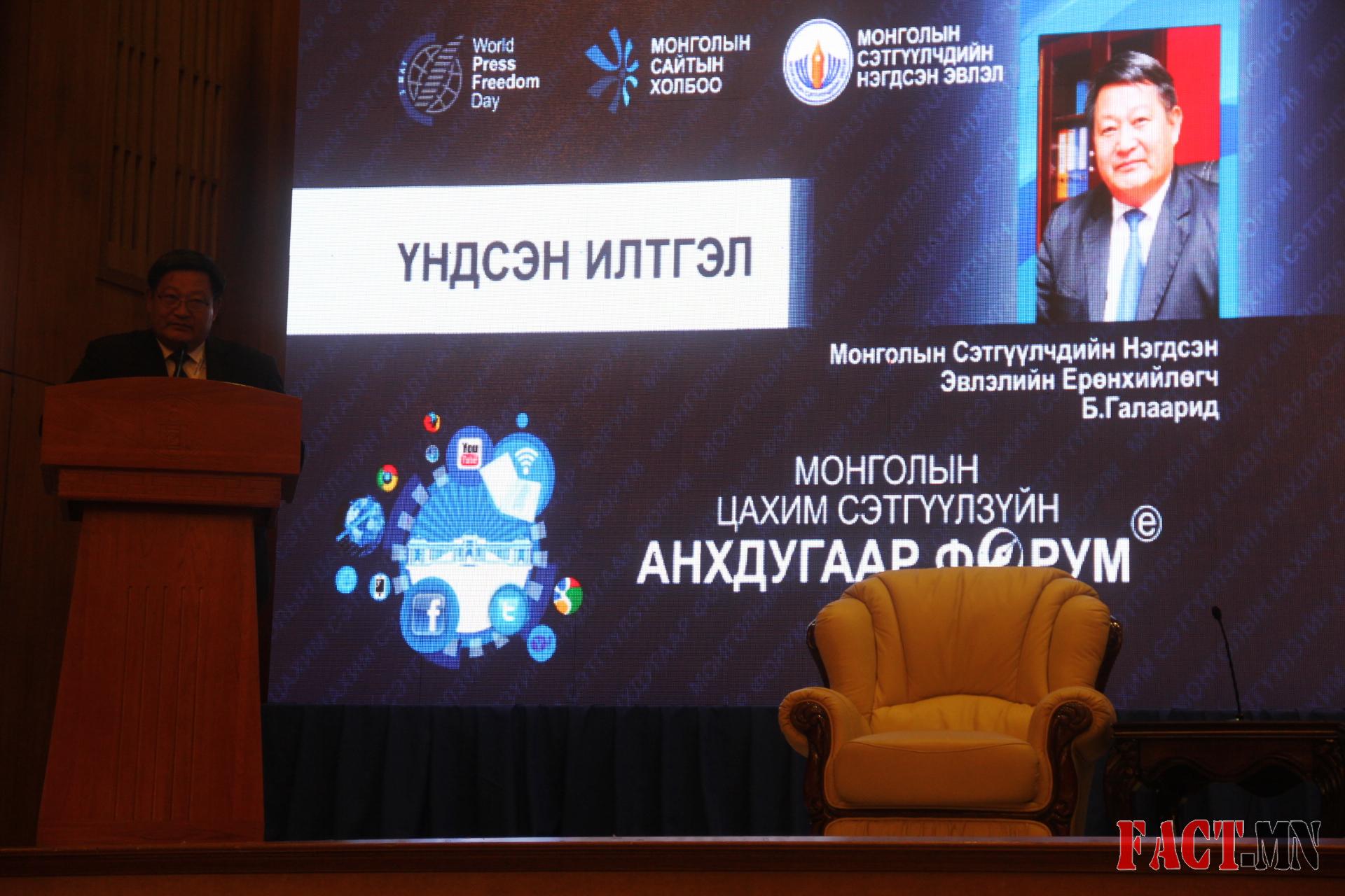 Форумыг нээж үндсэн илтгэлийг МСНЭ-ийн Ерөнхийлөгч Б.Галаарид тавьсан бол үргэлжлүүлэн “Монголын сайтын холбооны ерөнхийлөгч Х.Мандахбаяр нар өнөөгийн цахим сэтгүүл зүй болон түүний хөгжил цаашдын зорилтын талаар илтгэлүүд тавьсан юм. Тус илтгэлүүдэд мэргэжлийн ёс зүй нийгмийн хариуцлага бол бидний зорилго байх ёстой гэдгийг онцолж байлаа.