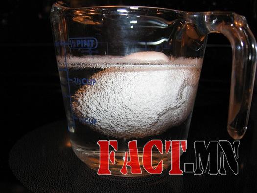 - Уксустай усанд өндгөө хийж 24 – 48 цаг буюу 1 – 2 хоног байлгах бөгөөд энэ хугацаанд өндөгний хальс бүрэн устаж жирийн нунтаг болох болно. Ингээд өндөг цууны хүчлээр дүүрч бамбалздаг резинэн төлөвт шилждэг ажээ.