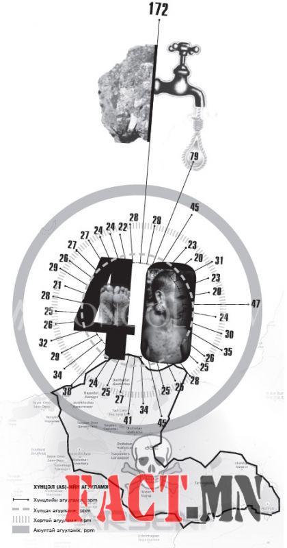 Эндээс харахад хүнцлийн хэмжээ нь хүн, мал, амьтан, байгаль орчинд ноцтой хохирол учруулахуйц хэмжээнд байгаа нь тогтоогдож, яаралтай арга хэмжээ авах хэрэгтэй болчихоод байгаа юм. Тухайлбал, дээрх 40 дээжийг харахад стандарт буюу хүлцэх хэмжээнээс давж хортой агууламжийн хэмжээнд хүрсэн 40, хортойгоос давсан 10, аюултай хэмжээнд хүрсэн зургаа, аюултай агууламжийн хэмжээнээс хэтэрсэн нь хоёр байгаа юм. Дэлхий нийтэд мөрдөж байгаа стандартаар усанд байх хүнцлийн агууламж 0.001 мг бол манайд нэг кг хөрс, усанд зургаан мг-аас их байвал хүний эрүүл мэндэд аюултай гэж тооцож байгаа. Агаарт ердөө 0.05 мг/л байхад л амьсгалаар дамжин биед орж, үхэлд хүргэх аюултай гэдгийг эрдэмтэн судлаачид батлаад буй. Энэ юуг хэлээд байна вэ гэхээр Дорнод аймгийн Дашбалбар сум химийн хороор хордож, нэн яаралтай нөхөн сэргээлт хийхгүй бол хүн, малд хортойгоор нөлөөлөн, Минаматагийн сүүдэр манайд хүүшлэхэд энүүхэнд болчихоод байгааг илэрхийллээ.