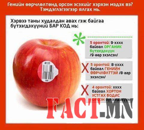 Генийн өөрчлөлттэй үр тариа, жимс хүнсний ногоо, бусад хүнсний бүтээгдэхүүнийг органикаас нь ялгаж болох уу? Тухайлбал генийн өөрчлөлттэй үр тариа, жимс хүнсний ногоо органикаасаа илүү “царайлаг”, муудахдаа удаан, зүсэж хэрчсэний дараа хэлбэр, өнгө зүс, үнэрээ алддаггүй зэрэг олон нийтлэг шинж тэмдэгтэй байдагийг анхаарах хэрэгтэй. Генийн өөрчлөлттэй хүнсний бүтээгдэхүүнийг хэрхэвч хэрэглэж болохгүй!!!!