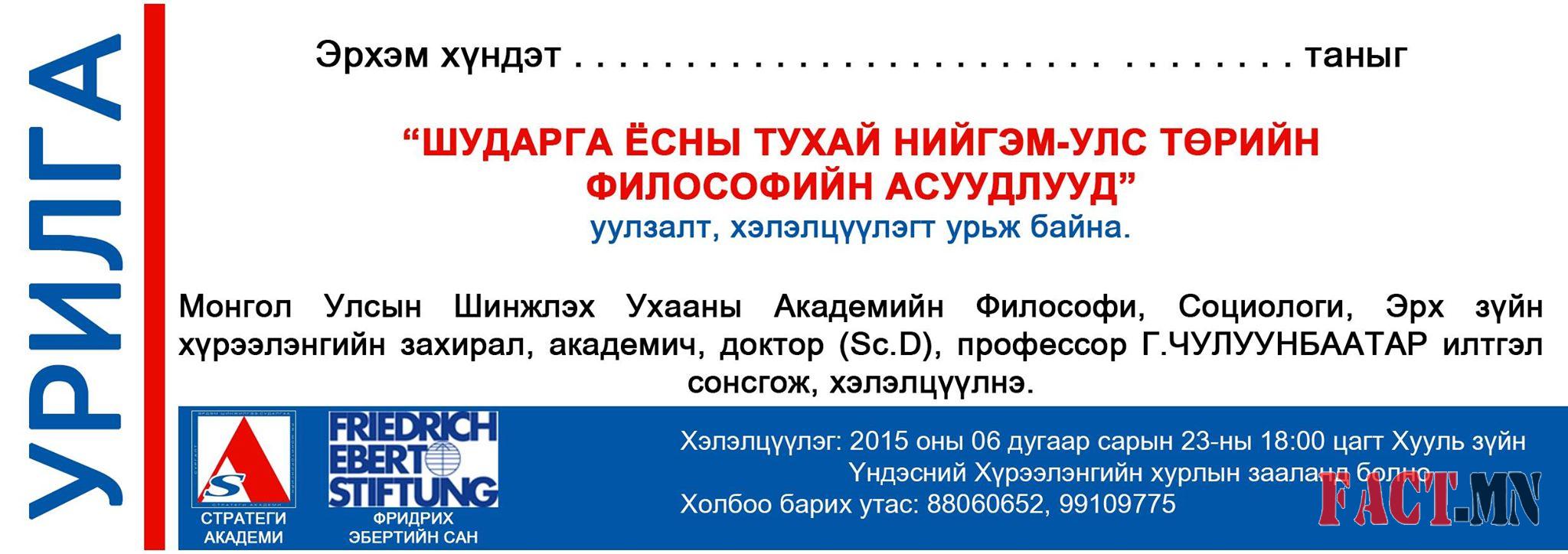 Хэлэлцүүлэгт МУ-ын Шинжлэх Ухааны Философи, Социологи, эрх зүйн Хүрээлэнгийн захирал, доктор(Sc.D), профессор Г.Чулуунбаатар илтгэл сонсгож, хэлэлцүүлэх юм.