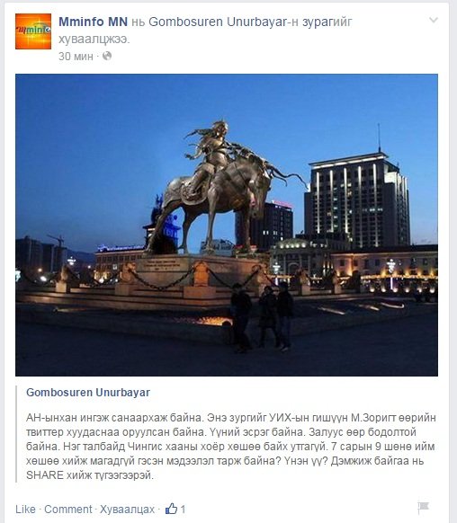 Энэ зургийг УИХ-ын гишүүн М.Зоригт өөрийн твиттер хуудаснаа оруулсан байх юм. Ер нь нэг талбайд Чингис хааны хоёр хөшөө байх утгагүй. Өмнө нь Сүхбаатарын талбай байсанг Чингисийн талбай болгож нэрийг нь солисон нь багадаад одоо бүр ор мөргүй болгох гэсэн санаархал. Энэ солих ажлаа ирэх 7 сарын 9 шөнө ийм хөшөө хийж магадгүй гэсэн мэдээлэл тарж байна? Үнэн үү? Хэрвээ үнэн бол арай л хэтэрсэн түүхээ үгүйсгэсэн манайх шиг улстөрчидтэй улс үндэстэн байдаг юм болов уу?