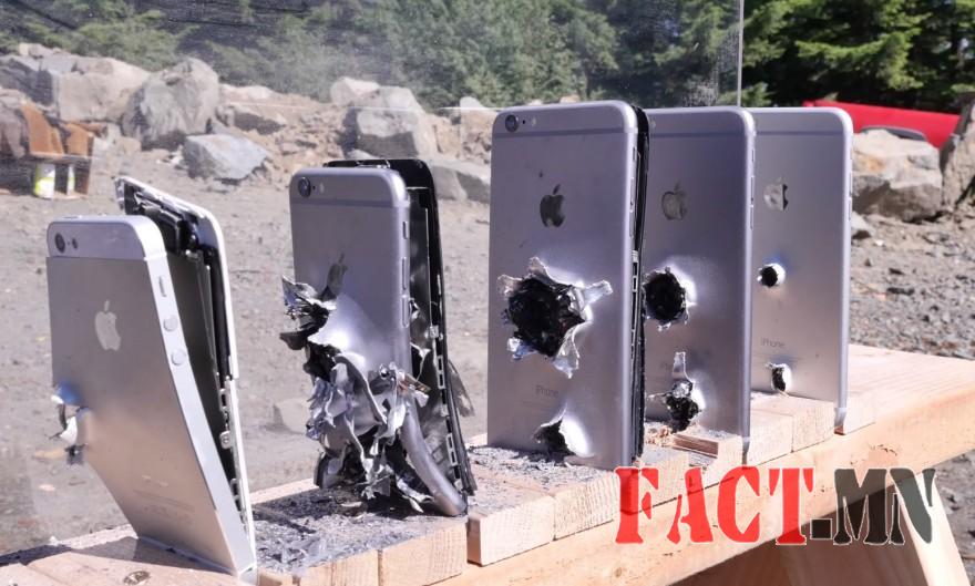 Өнөө цагийн хамгийн бат бөх ухаалаг гар утас бол iPhone гэдгийг “EverythingApplePro” блогийн хөтлөгч Даниел гэх эр батлахыг хичээсэн байна. Тэрбээр зургаан гар утсыг дараалан тавьж, АК-47 автомат буугаар хэд хэдэн удаа бууджээ. Дүрс бичлэгт iPhone гар утас автомат бууны сумны цохилтын хүчийг сааруулах маш өндөр чадвартай болохыг анзаарах болно. Ийм туршилтыг өөр ухаалаг гар утсанд туршиж үзэхэд 10 гаруй ухаалаг утас ч АК-47 автомат бууны сумыг тогтоож дийлээгүй юм. Туршилтын дараа Даниел “Iphone бол хамгийн шилдэг үйлдлийн системтэйн дээр хамгийн хүчирхэг гадаргуу, метал хийцтэй гэдгийг харж болно” гэжээ.URL: