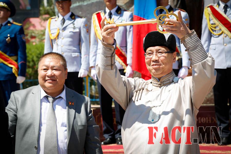 Налайх хотын Захирагч Ш.Хаанд Нийслэлийн Засаг дарга бөгөөд Улаанбаатар хотын Захирагч Э.Бат-Үүл Захирагчийн мөнгөн гэрэгэ, Налайх дүүргийн Засаг дарга Х.Болдбаатар Налайх хотын бэлгэдэл түлхүүрийг гардууллаа.