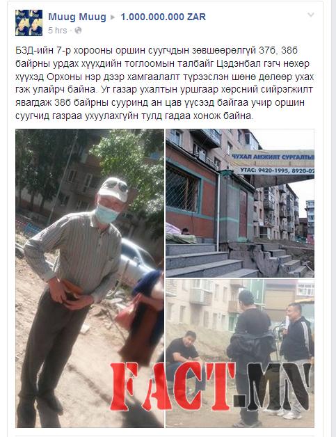 Баянзүрх дүүргийн 7-р хорооны оршин суугчдын зөвшөөрөлгүй 37б, 38б байрны урдах хүүхдийн тоглоомын талбайг Цэдэнбал гэгч нөхөр хүүхэд Орхоны нэр дээр хамгаалалт түрээслэн шөнө дөлөөр ухах гэж улайрч байна. Уг газар ухалтын уршгаар хөрсний сийрэгжилт явагдаж 38б байрны сууринд ан цав үүсээд байгаа учир оршин суугчид газраа ухуулахгүйн тулд гадаа хонож байна.