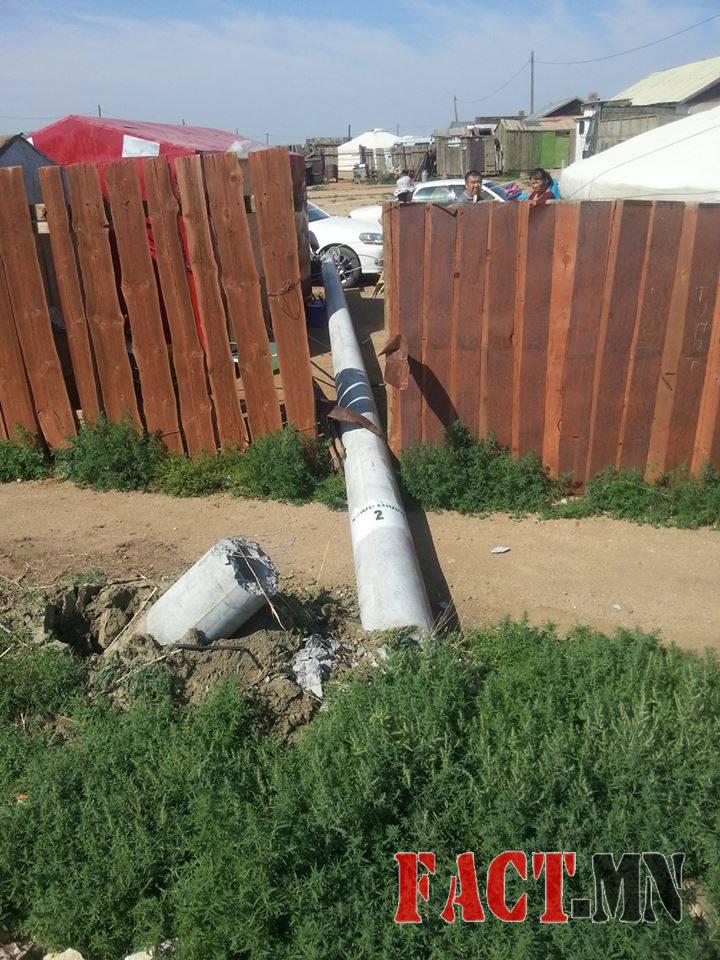 Ийм эмгэнэлтэй хэрэг гарчээ. Айлын хашааны гадна байрласан гэрэлийн шон хугарчээ. Хугарсан шонгийн мод айлын хашааг эвдэн айлын үүдэнд хөндлөн унасан байна. Азаар хүн гэмтээгүй байна. Уг шонг цементээр цутгаж хийсэн бөгөөд сүүлийн үед гэр хорооллын дундах гэрлийн шонг ингэж сольж байгаа аж. Гэвч энэ нь маш хэврэг болох нь харагдаж байна.