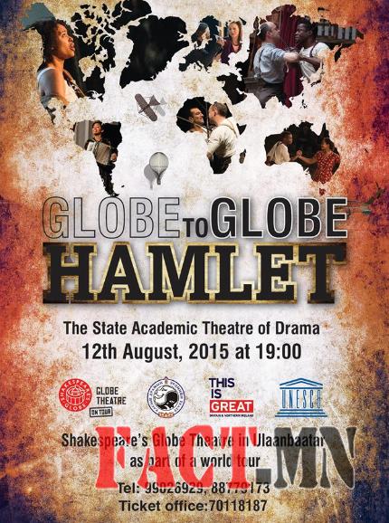 Их Британийн алдарт “Globe” театрын уран бүтээлчид өнөөдөр Монголын тайзнаа “Гамлет” жүжгийг тоглох гэж байна. Уран бүтээлчид энэхүү жүжгийг Англи хэл дээр шинэчилсэн найруулгаар Улсын драмын эрдмийн театрын тайзнаа өнөөдөр буюу наймдугаар сарын 12-ны 19.00 цагаас тоглох юм.
