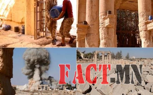 ПАЛЬМИРА. /Xinhua/. Сирийн эртний Пальмира хот дахь Ромын эзэнт гүрний үед хамаарах сүмийг устгаж байгаагаа харуулсан гэрэл зургуудыг “Лалын улс” босогчдын цэрэгжсэн бүлэглэл дэлгэлээ. Гэрэл зургуудыг харвал, босогчид Баалшамин сүмд тэсрэх төхөөргүүд дэлбэлжээ. Мөн нурангийг нь овоолсон зургийг онлайнд тавьсан байна.МЭ I зууны үед баригдсан тус сүм нь Пальмирагийн хамгийн сайн хадгалагдан үлдсэн соёлын үнэт өвүүдийн нэг байсан юм. Сирийн Засгийн газрын мэдэгдсэнээр, босогчид сүмийг өнгөрсөн долоо хоногийн ням гарагт сүйтгэсэн. Лалын хэт давруу үзлийнхээ улмаас “Лалын улс”-ын босогчид түүх болоод соёлын олон үнэт өвтийг устгасаар байгаа юм.