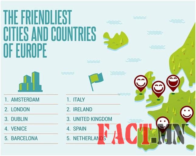 Европын хамгийн найрсаг улс Итали, Ирланд, Их Британи, Испани, Нидерланд гэсэн дүн гарсан байна. Ялангуяа Нидерландын нийслэл Амстердам хотынхны найрсаг зан, халуун дулаан сэтгэлийг жуулчид онцгойлон үнэлсэн гэнэ. Харилцааны ийм найрсаг сайхан уур амьсгал бүрдүүлсэн Европын хотуудын тоонд мөн Лондон, Дублин, Венеци, Барселон багтсан байна.