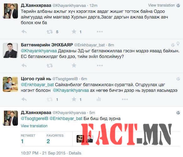 Тодруулбал, Тэгвэл Ерөнхий сайдыг огцруулах саналд УИХ-ын гишүүн Д.Хаянхярваа нэгдсэн байна. Тэрбээр өчигдөр твиттер хуудсаараа дамжуулан мэдэгдсэн юм. Ийн мэдэгдэхдээ “Би биш бид зурна” гэсэн нь өөрийн эрхгүй олны анхаарлыг татаж байна. УИХ-ын гишүүн Д.Хаянхярваа огцруулах саналд нэгдэхдээ “Ажлаа мэддэггүй, худлаа ярьдаг, хууль мөрддөггүй худалч, шоучин Ерөнхий сайдаас салах цаг болсон” хэмээн жиргэсэн юм. Гэхдээ одоогоор УИХ-ын гишүүн Д.Хаянхярваа гишүүнээс өөр хэн дэмжиж гарын үсэг зурах нь одоогоор тодорхойгүй байна.