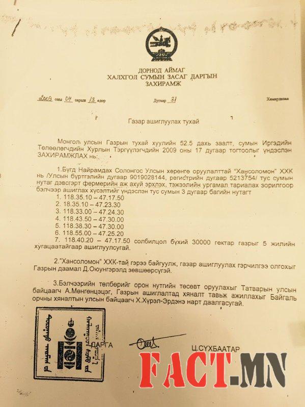 Р.Бураа: 2009 онд Солонгосын компанид хугацаагүйгээр газар ашиглуулахаар 30,000 га газар Халх голын Засаг дарга н.Сүхбаатар олгосон байна