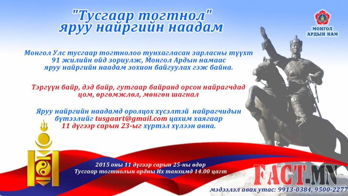 Монгол Улс тусгаар тогтнолоо тунхаглан зарласны түүхт 90 жилийн ойд зориулж, Монгол Ардын намаас яруу найргийн тэмцээн зохион байгуулах гэж байна. “Тусгаар тогтнол” яруу найргийн наадамд оролцох хүсэлтэй найрагчид tusgaart@gmail.com цахим хаягаар өөрийн бүтээлээ арваннэгдүгээр 23-ны өдрийг хүртэл ирүүлж болно. Энэхүү наадам гурван үе шаттай явагдах бөгөөд эхний шатанд чөлөөт сэдэв, хоёр, гуравдугаар шатанд эх орны сэдвээр бичсэнбүтээл унших юм байна. Нийт бүтээлээ ирүүлсэн найрагчдаас шигшиж, эхний шатанд 15 найрагчийг оролцуулж, дараагийн шатанд 10, сүүлийн шатанд таван найрагч тунаж үлдэх юм. Сүүлийн шатанд үлдсэн таван найрагчаас тэргүүн, дэд, гутгаар байрыг шалгаруулна. “Тусгаар тогтнол” яруу найргийн наадам 2015 оны арваннэгдүгээр сарын 25-ны өдөр Тусгаар тогтнолын ордны Их танхимд 14.00 цагт болно. Тэргүүн байр, дэд байр, гутгаар байранд орсон найрагчдад цом, өргөмжлөл, мөнгөн шагнал өгөх аж. Наадамтай холбоотой мэдээлэл авах бол 9913-0384, 9500-2277 утсаар холбоо барина уу.