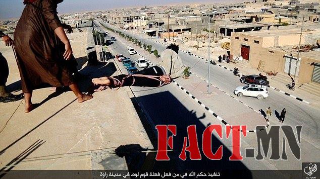 Иракийн хэт даврагч “Халифын вант улс” бүлэглэл өчигдөр 20.00 цагт өөрийн твиттер хуудастаа 10 минут үргэлжлэх видео бичлэг байршуулсан тухай “www.dailymail.co.uk” мэдээллээ. Уг бичлэгт хэт даврагчид 47 залууг өндөр барилгаас шидэж дараа нь толгой тус газар руу нь бууджээ.