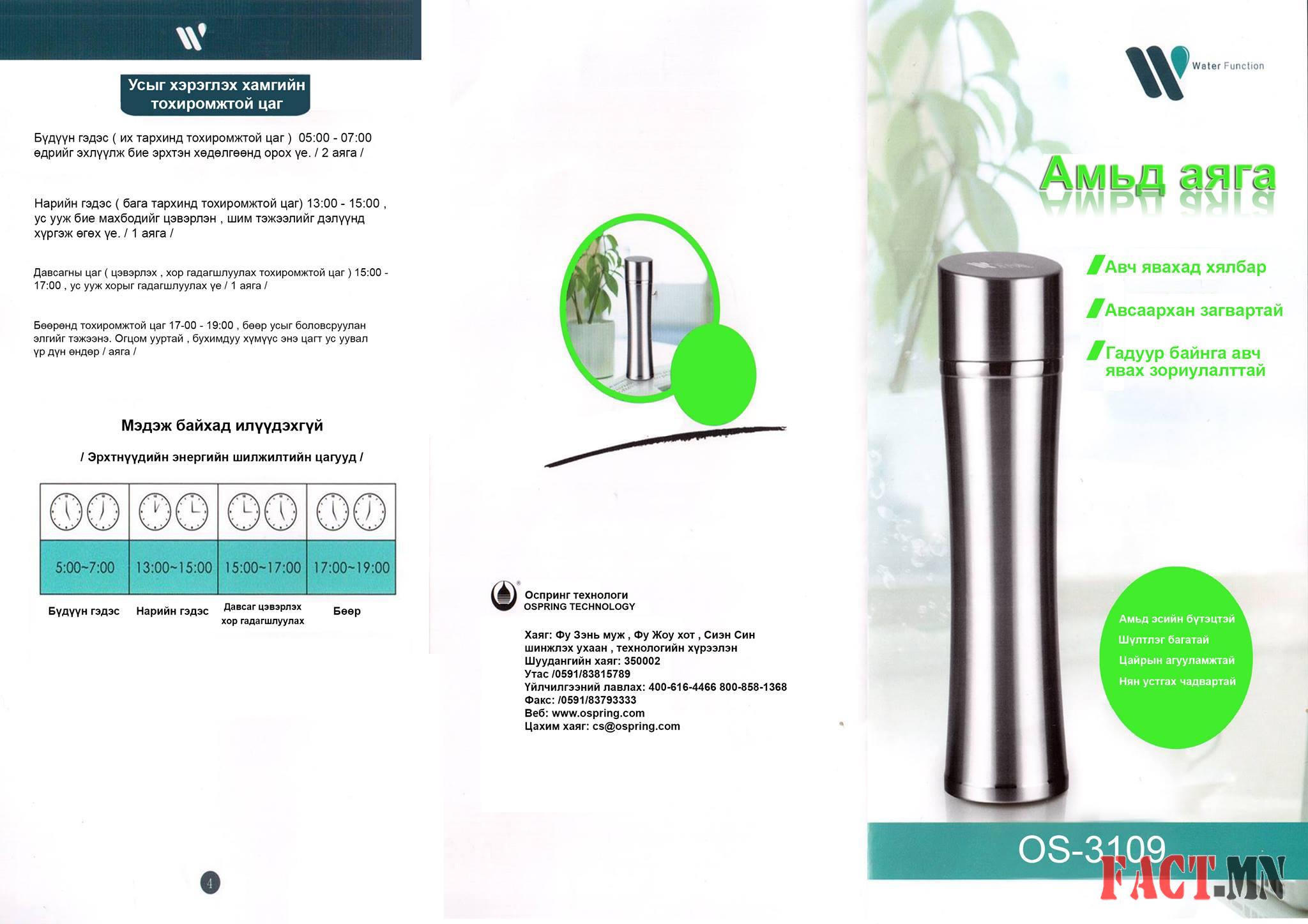 Америкийн Нэгдсэн Улс, Бүгд Найрамдах Хятад Ард Улсын хамтарсан “Fujian Ospring Technology & Development” Co.,LTD нь 20 жилийн түүхтэй, дэлхийн 16 оронд салбар төлөөлөгчийн газартай, Дэлхийн Усны Шинжлэх Ухаанд чухал хувь нэмэр оруулж буй компани юм. “Fujian Ospring Technology & Development” Co.,LTD -ын OSPRING брэндийн ус шүүгч бүтээгдэхүүнүүд нь тухайн хоёр улсын Усны Шинжлэх Ухааны салбарт тэргүүлэх зэрэглэлтэй эрдэмтэн, судлаачдынхамтын хөдөлмөрийн үр дүнд бий болсон  Байгаль Орчинд ээлтэй технологи юм.